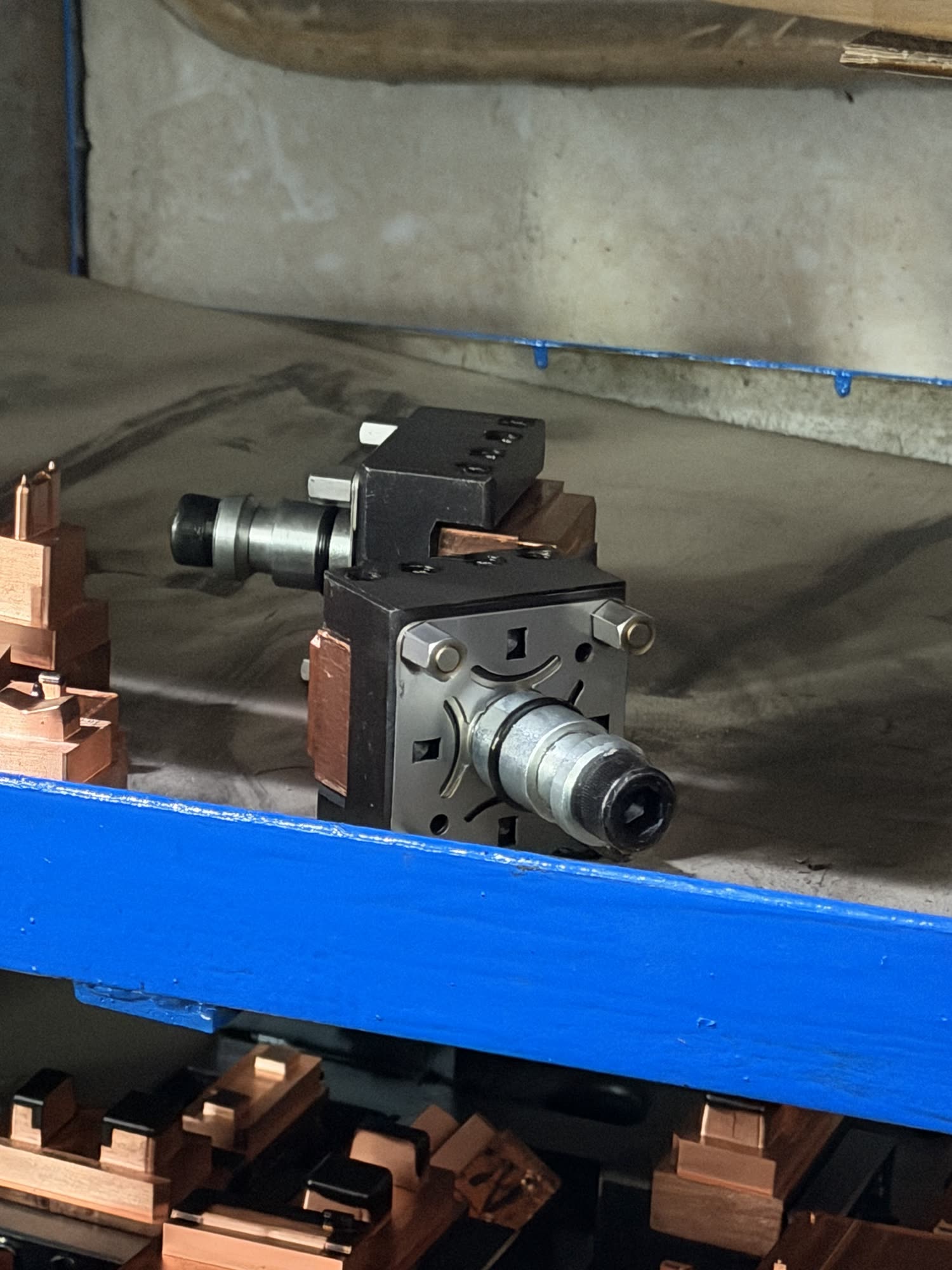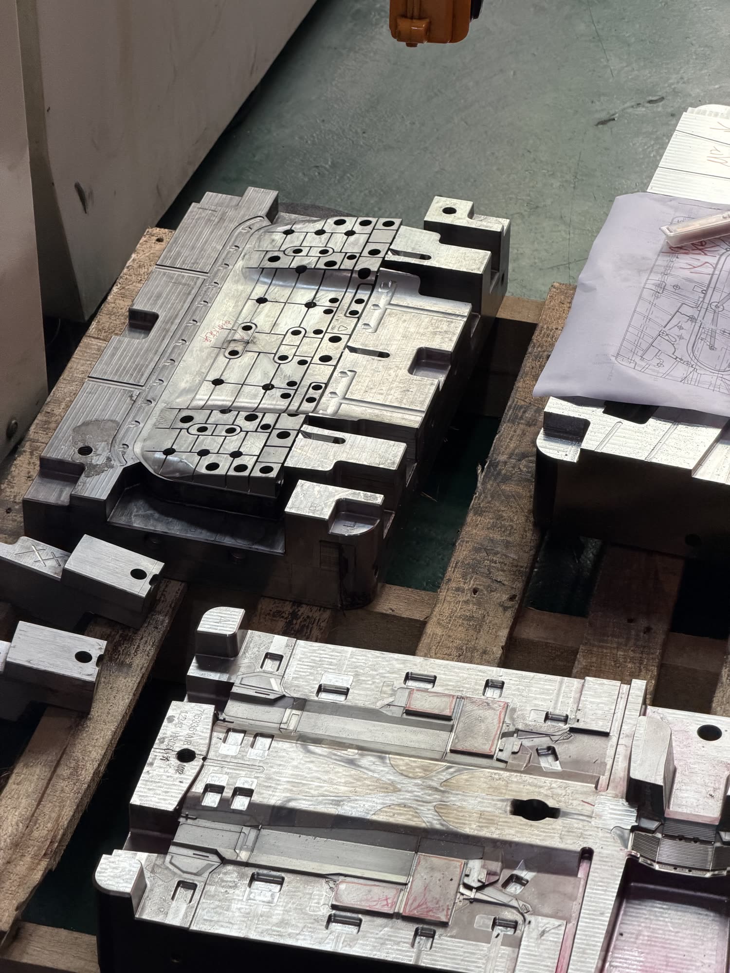 Punching gates in a mould, and an in-progress unit.