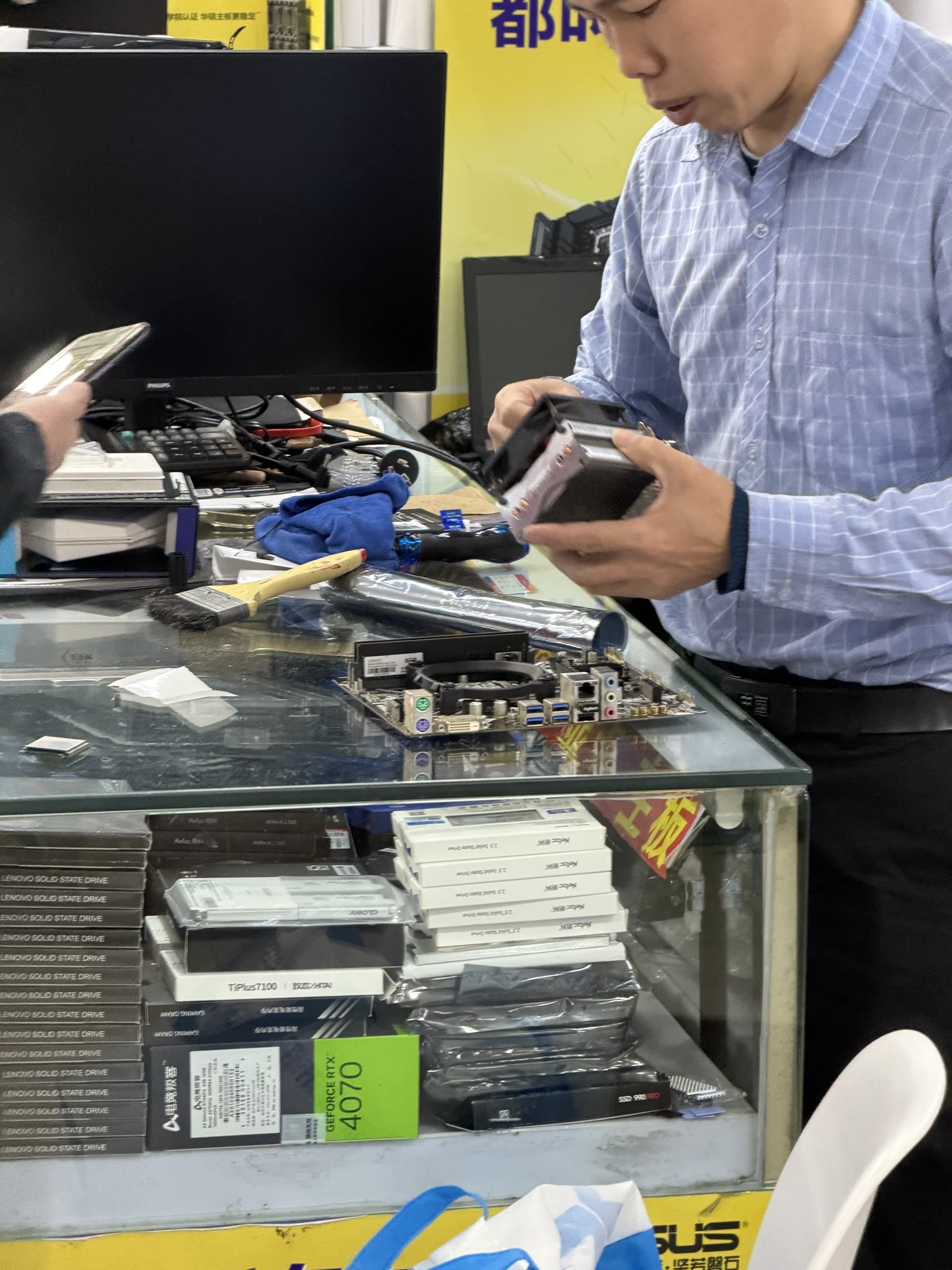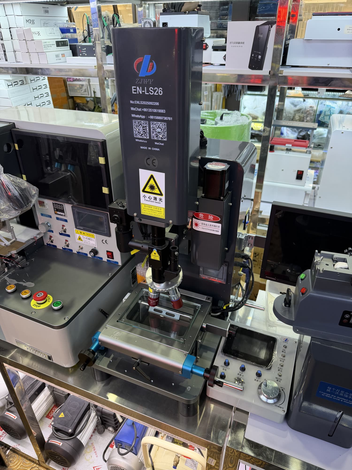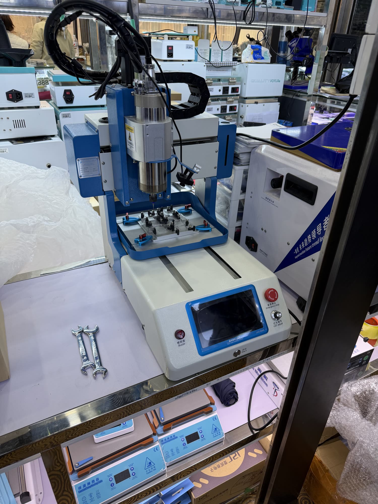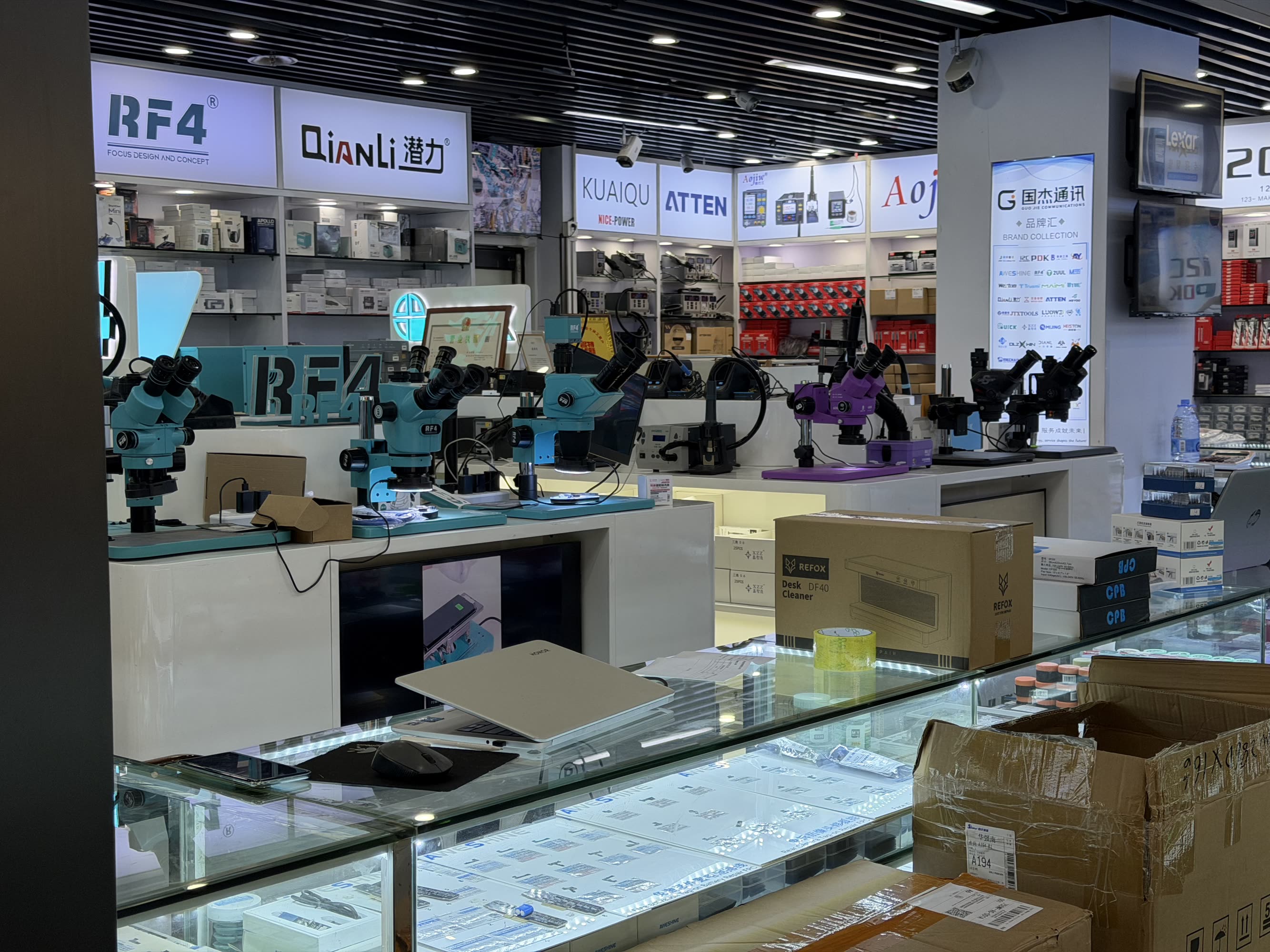 I saw microscopes and BGA rework stations and countless fixtures and jigs. There is a block where you can get every part to make an iPhone and then also the tools to put it together with.