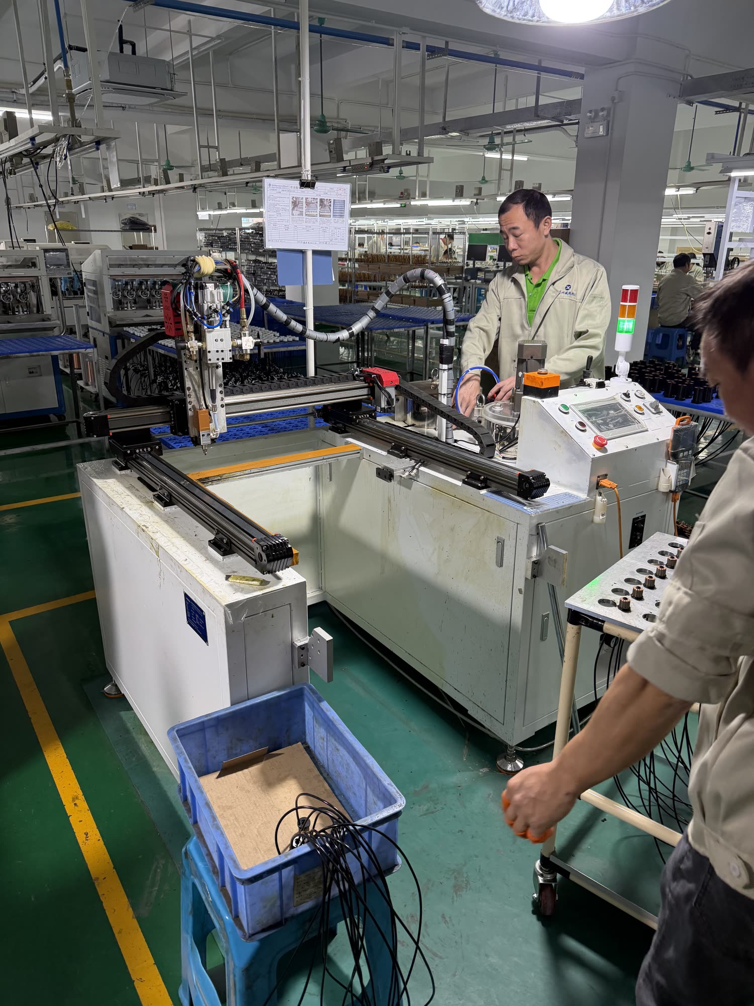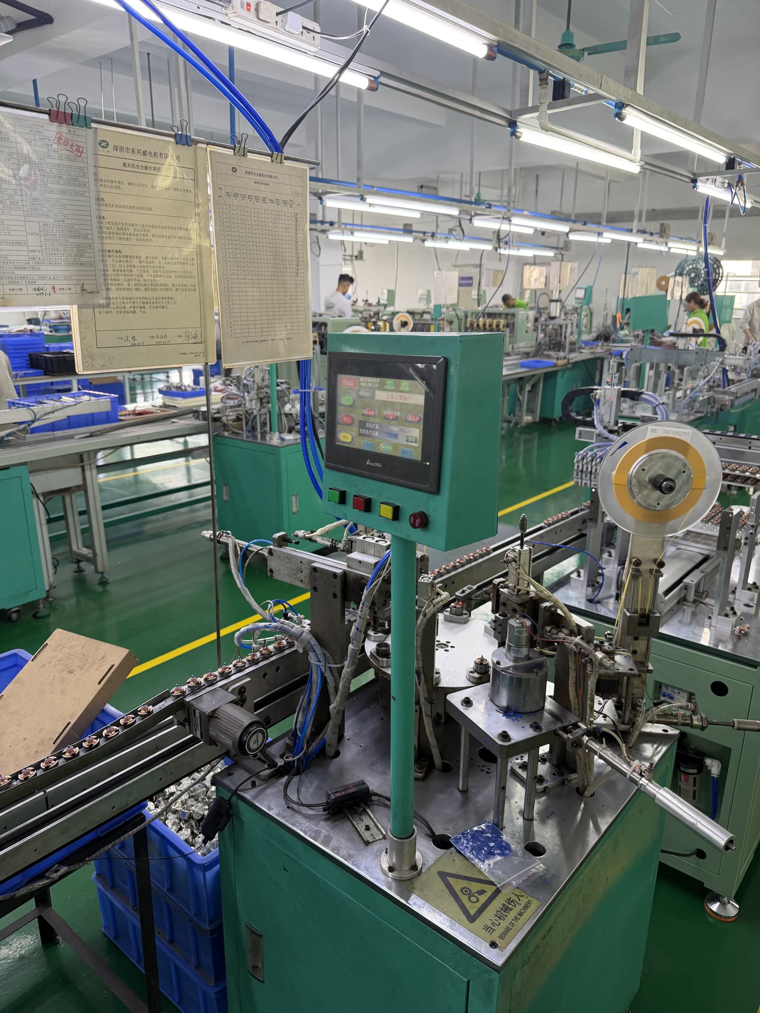 Hadn’t seen a coil winder in person before so that was excellent. Again there are many many humans here: moving things between machines, operating them directly, testing motors one at a time, and doing fine-dexterity work like terminating windings onto housing connnectors.